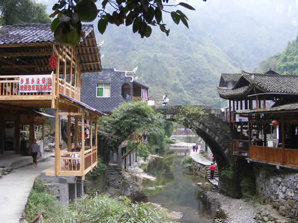 德夯風(fēng)景區(qū) 德夯景區(qū)古風(fēng)猶存,人文景觀眾多,景區(qū)到處都呈現(xiàn)著遠(yuǎn)古文化風(fēng)貌,苗寨依山而建,飛檐蹺角,半遮半掩,封火墻、雕花窗,造形奇特,格調(diào)鮮明,色彩分逞,豐富多彩,無不顯示出遠(yuǎn)古遺民的氛圍。田野里,溪河傍,終日旋轉(zhuǎn),人們用他碾米或加工紙漿,碾盤時(shí)時(shí)發(fā)出“哐鐺、哐鐺”石頭撞擊聲,以示古代文明。人們用原始的方法造紙、織布、染布、榨油。用厚重的木船擺渡,索索船隨處可見。人們?cè)诩线M(jìn)行交易,量具多使升、斗器具,買賣雙方在衣角內(nèi)摸手講價(jià)。景區(qū)苗民許多習(xí)俗稀奇古怪,難以用語言敘述。這里的一切都顯示著原始古老,與大山外面的現(xiàn)代城市形成了鮮明對(duì)照,因此,聞之而來的旅游者、古文化研究者紛至而來,絡(luò)繹不絕,探索者成千上萬。