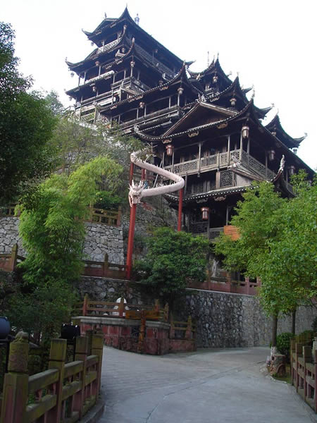 九重天世襲堂是土家風(fēng)情園的精華和靈魂所在。該建筑由土家民間藝人李宏進(jìn)設(shè)計(jì),依80度陡坡而建,高48米,共9重12層,整個(gè)樓房全部用木栓連接,沒(méi)有一顆鐵釘,堪稱(chēng)土家族建筑史上的奇跡。2002年9 月22日,九重天吊腳樓被載入世界吉尼斯世界紀(jì)錄,認(rèn)定其為目前中國(guó)最大、最高、最完美的木質(zhì)結(jié)構(gòu)吊腳樓。2001年4月6日,朱镕基總理視察土家風(fēng)情園時(shí),對(duì)九重天贊不絕口:“一批民間匠人能造出這樣輝煌的吊腳樓,而且還解決了力學(xué)的問(wèn)題,真是不簡(jiǎn)單。”清華大學(xué)著名建筑學(xué)家何重義先生說(shuō):“張家界土家風(fēng)情園完全可以和蘇州的園林相媲美。特別是九重天世襲堂,猶如玉宇瓊閣,令人神往!”古人說(shuō),天有九野,地有九州,土有九山,山有九寨。古人又把九重叫做天,說(shuō)天有九重,最上一重是上帝和君主居住的地方,所以我們叫它“九重天”。