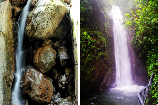 西線原名叫雪花溪,又叫雪花洞,水從懸崖上掉下來濺起水花,泉水與巖石相碰,落成大霧,形成雪花狀,故名雪花溪。因地勢險峻,歷代人都沒有把雪花溪走通過,從下往上看深不見底,古人以為是一個洞,故又叫雪花洞,其實(shí)是一個峽谷,有七潭七瀑,現(xiàn)在叫“仙女峽谷”。峽谷長800米,最窄處僅1米左右,上下落差近200米,因水的長期回旋沖刷, 巖層的堅(jiān)硬度各異,形成了底寬頂窄,時北,時西,時東,陰暗無光,形似溶洞, 泉水飛流直下,形成梯級瀑布,擊打在巖壁上濺起的水花猶如雪花飛舞,潭中一片雪白,古人稱之為雪花洞,峽谷中有七個各異的潭池在沖擊的水花中若隱若現(xiàn),故改稱為七仙女人間沐浴瑤池,從開天辟地起無人行通過,現(xiàn)在已修好的占道,于峽谷水花之中,幻入仙境之感。